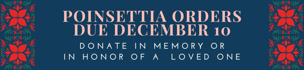 Poinsettias adorn the sanctuary on Christmas Eve. Donate in honor or in memory of a loved one or someone you want to celebrate for their life and ministry at the church. Orders are due by December 10 for publication in the bulletin on December 21. This year’s price is $22. Individual acknowledgments will not be sent.
