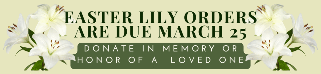 Lilies adorn the sanctuary on Easter Sunday. You can donate a lily in honor or memory of a loved one or someone you want to celebrate for their life and ministry at the church. This year’s price per lily is $22. Orders are due by Wednesday, March 25, for publication in the Easter bulletin on April 5.
